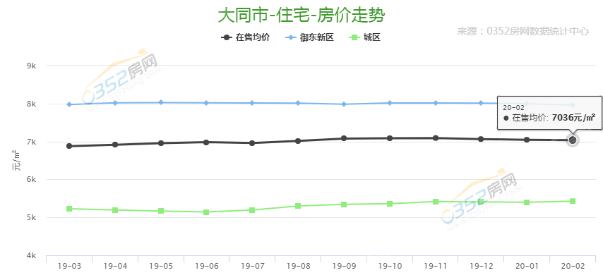 據0352房網數據顯示,2020年2月大同在售商品房均價為7036元/㎡,2020年1月大同在售商品房均價為7045元。相比2020年1月份,2020年2月大同在售商品房價格小幅下降,每平米下降9元,波動不大。分析區域來看,2月御東新區在售商品房均價為7959元/㎡,市區在售商品房均價為5427元/㎡。
