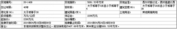 六、 本次國有土地使用權掛牌活動 在 太原市國土資源交易事務中心(太原市金剛堰路2號國土大樓一層) 進行。各地塊掛牌時間分別為:SG-1408 號地塊:2014年04月10日08時00分 至 2014年04月24日16時30分 ;