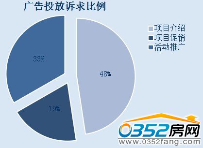 廣告中,訴求點(diǎn)是關(guān)鍵內(nèi)容,在此次統(tǒng)計(jì)中,有半數(shù)多的樓盤投放信息是相關(guān)的項(xiàng)目介紹,其次是開發(fā)公司推廣活動(dòng),而其中項(xiàng)目銷售也占一部分,這也和項(xiàng)目具體的銷售節(jié)點(diǎn)有關(guān)。